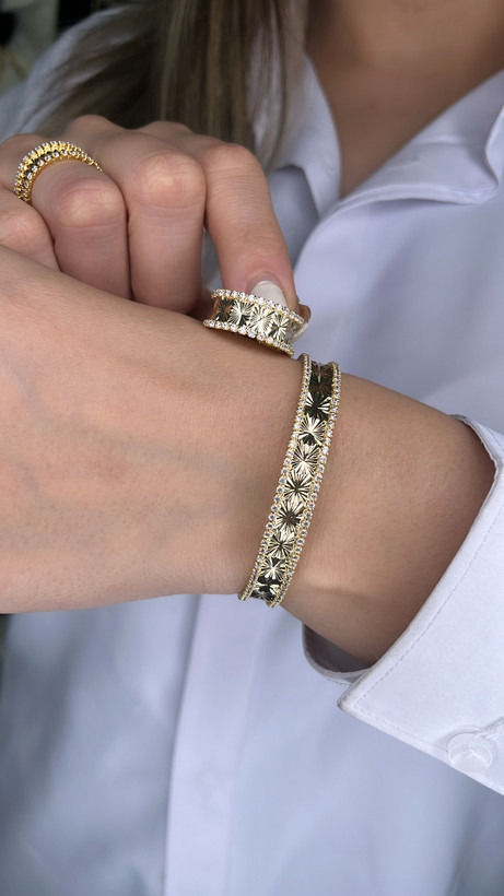 ست دستبند و انگشتر جواهری تراشدار طرح گل طلایی
